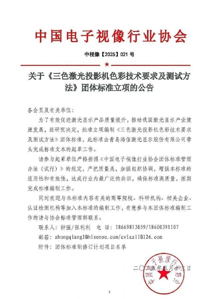 近日,中国电子视像行业协会,正式批准立项编制《三色激光投影机色彩技术要求及测试方法》团体标准。该标准将由青岛海信激光显示股份有限公司等行业企业牵头完成,并在未来适当时机向国际标准组织推广。