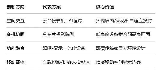 此外,在应用上,家用智能投影也可以开拓新篇章。比如,多台机型的联动应用——如射灯一般的一个投影阵列,让低亮度、轻巧产品也能“好玩”。再比如,汽车数字大灯可以是投影,那么居家的照明为什么不能是“显示照明”一体设备呢?或者通过AI功能设计,发展差异化体验、主动应用的投影产品,甚至让投影机可以自由移动,发展投影机器人智能体。