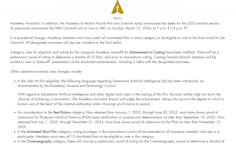 奥斯卡最新指南强调,AI工具的使用不影响影片提名资格,但评选将重点考虑「创作中是否以人类为主导」;艾美奖方面也表示,参选作品必须体现提交者本人的艺术劳动,AI仅能作为辅助工具。