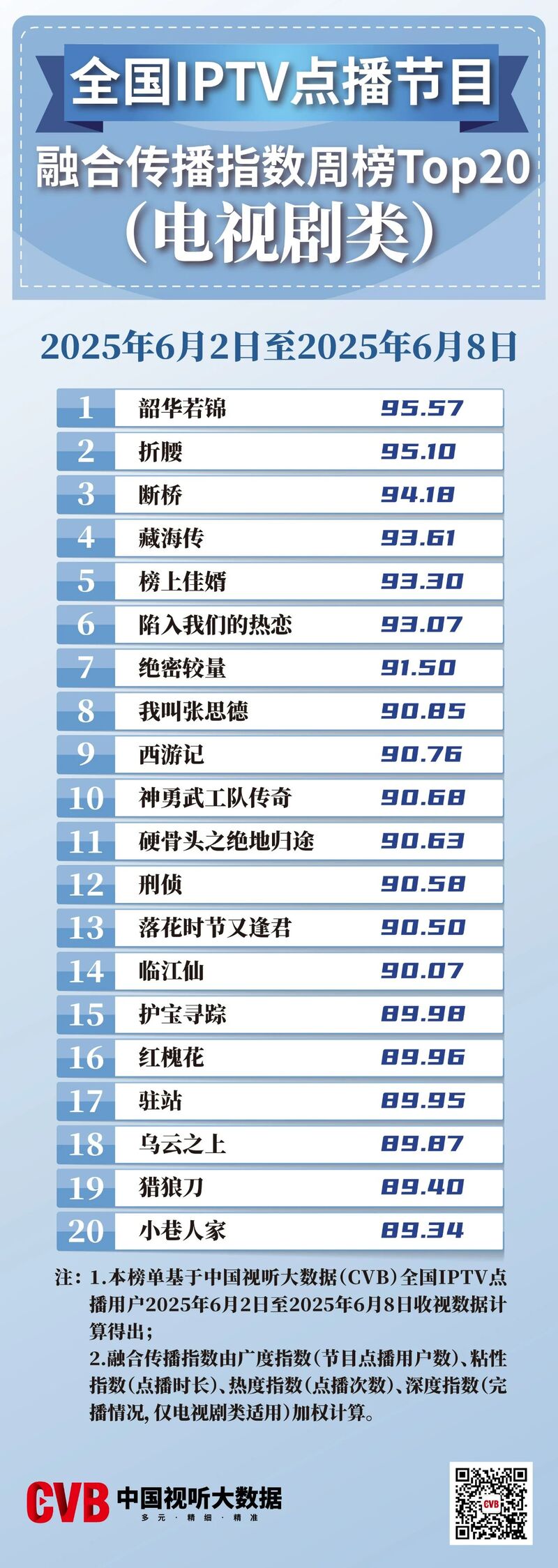 CVB数据发布:全国IPTV点播节目融合传播指数周榜Top20(电视剧类)【6月2日-6月8日】