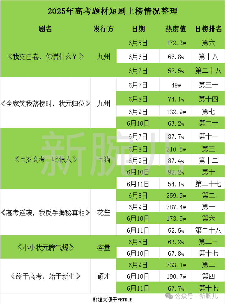 新腕儿就今年各家的高考题材短剧成绩,以登上WETRUE榜单为基准,进行一番梳理,以便直观洞察到市场情况。