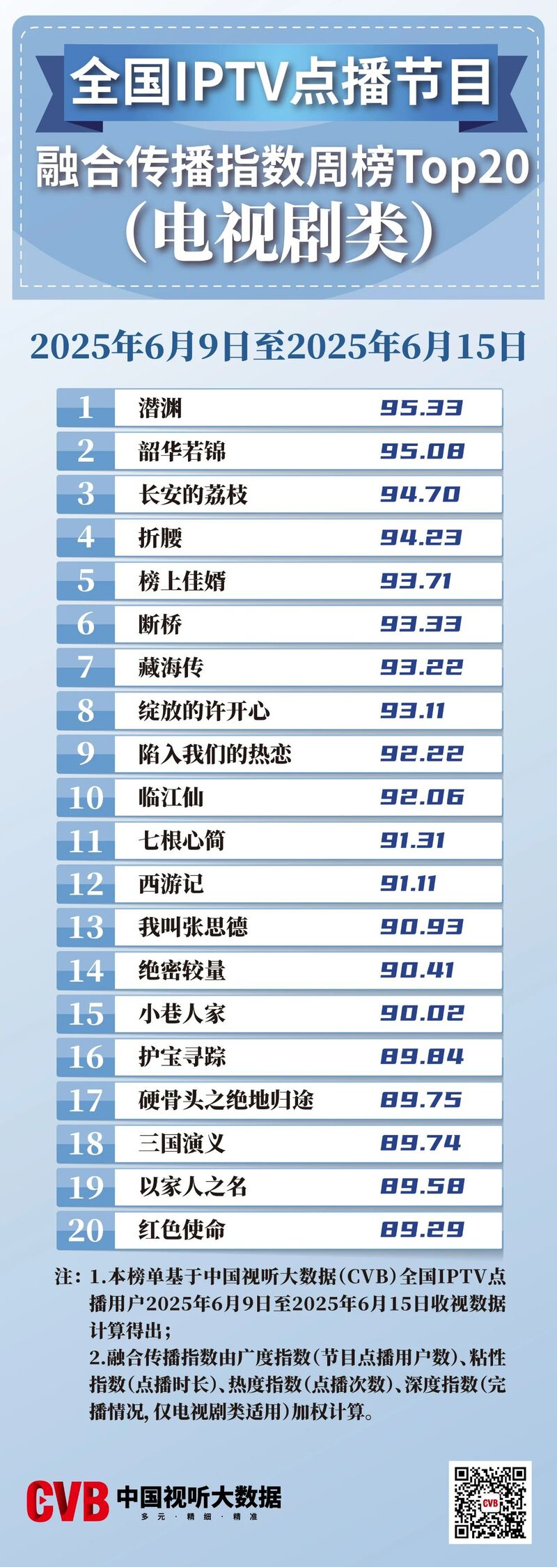 CVB数据发布:全国IPTV点播节目融合传播指数周榜Top20(电视剧类)【6月9日-6月15日】