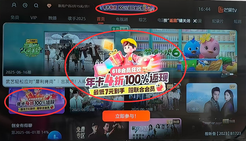 芒果TV的618活动,在弹窗广告,在首页首屏,在顶部功能栏,广告海报的区别底色很醒目,年卡4折、100%返现的力度也很吸引人。