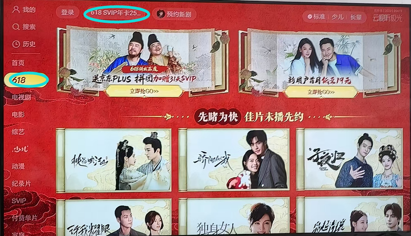 爱优腾的首页设计颇有异曲同工之处,左侧栏目导航,顶部功能栏,余下是大面积的视频和海报。云视听极光和CIBN酷喵,都重点在栏目导航那里做618促销,云视听极光是单独加了个618栏目专页出来,CIBN酷喵则是在SVIP的栏目上加了618角标。