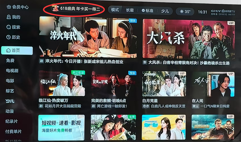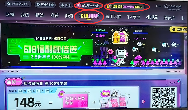 进入首页,云视听小电视也是把618铺满,栏目导航C位有618秒杀专页,顶部功能栏还有618年卡3.8折以及100%中奖的彩色字体广告,想不看见都不行。