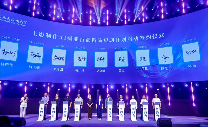 发布会上,在上海广播电视台副台长、副总编辑尹欣和上海电影集团有限公司党委书记、董事长王隽的共同见证下,“AI赋能百部精品短剧计划”正式签约启动,包括SMG看东方、咪咕数媒、中文在线、华谊兄弟等在内的八家单位上台签约。