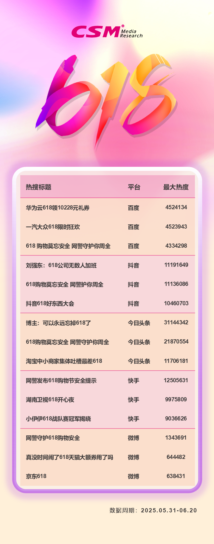 百度热搜被“华为云10228元礼券”的数字刷屏,抖音让“刘强东谈618加班”的企业侧写冲上顶流,今日头条上“可以永远忘掉618”的吐槽与“网警守护购物安全”的蓝V提示并排而立,像极了消费者纠结的内心戏——当“满300减50”的算术题消失在热搜栏,百万热度的“购物安全”却在各大平台反复出现。这不是消费热情降温,而是人们开始在“加购”前先搜索“避雷指南”,那些飘红的数字背后,藏着当代人“狂欢也要戴安全帽”的谨慎。
