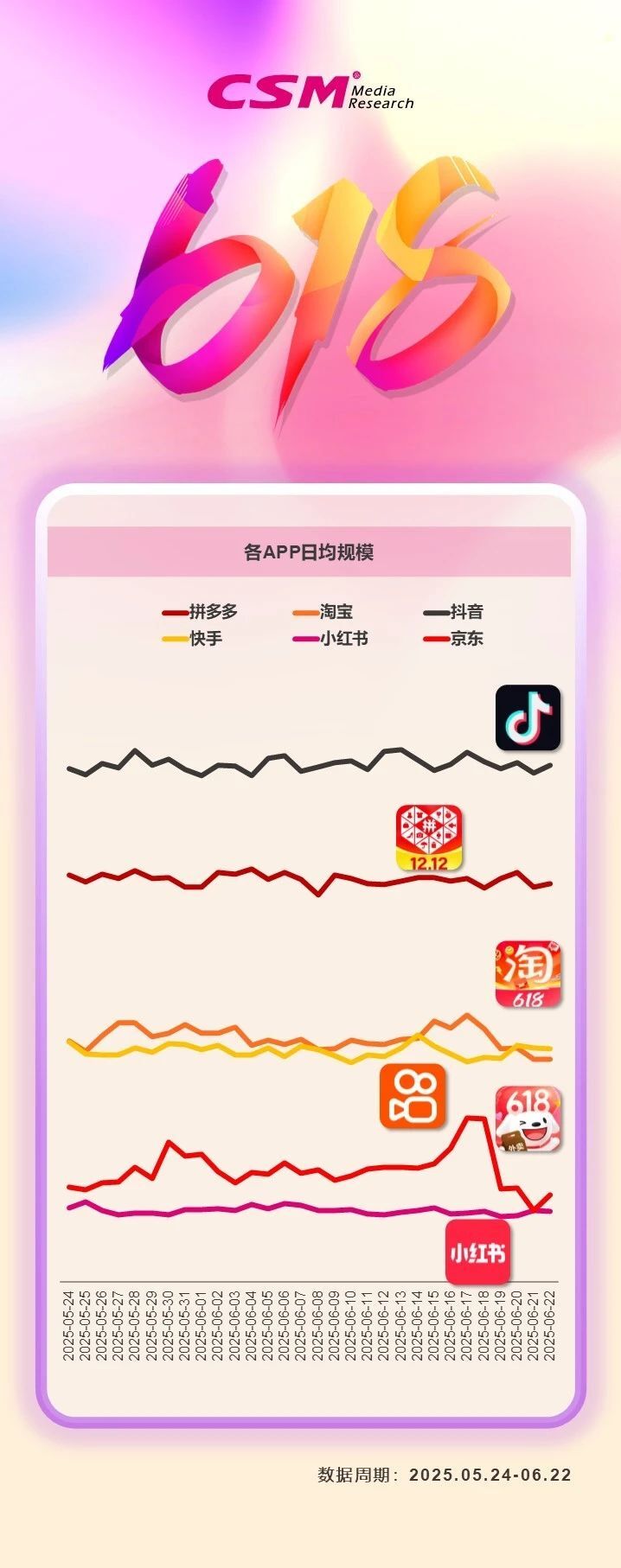 剖开618期间的屏幕使用数据,平台与用户的真实博弈浮出水面——抖音稳坐流量王座,直播间里“一件直降”的红色标签比数学公式更撩动心弦;拼多多透着日常囤货党雷打不动的消费惯性;最具戏剧张力的当属京东:6月18日当天的峰值数据,较活动前一周暴涨近两倍,重演"最后1小时抢购"的经典戏码;快手和淘宝的加购纠结,撞上“标记生活”到“种草消费”的小红书,娱乐流量与理性消费在数据坐标轴上完成握手,2025年的618终于写下新注脚:直播间的灯光与购物车的犹豫,正在达成微妙的和解。