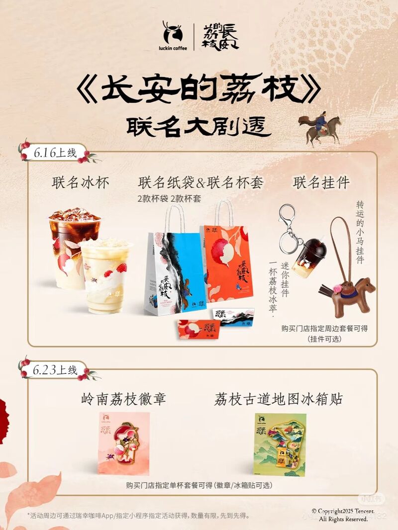 瑞幸咖啡紧跟热点,与《长安的荔枝》联名推出长安的荔枝冻冻、长安的荔枝冰萃和荔枝大福三款新品,同时还打造了荔枝冰萃系列的周边产品和千荔马挂件,千荔马也被网友称为“转运小马”。