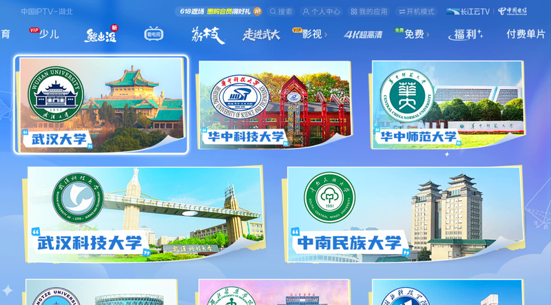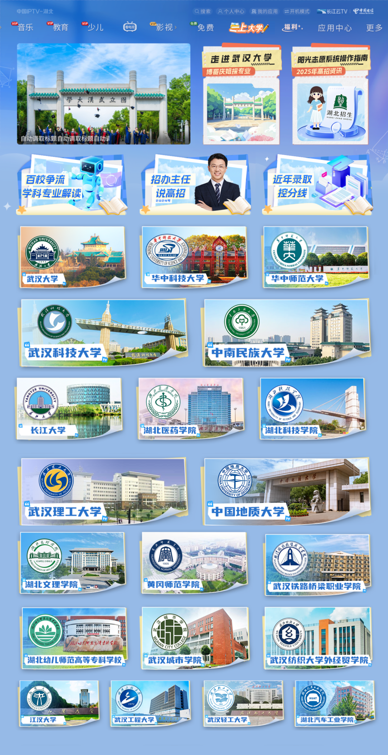 为积极响应国家教育信息化战略,长江云TV于近日正式上线“上大学”专区,以IPTV电视大屏为载体,为湖北用户构建权威高招信息服务枢纽。这一创新实践标志着媒体与教育领域的深度融合,为行业数智化变革提供示范样本。