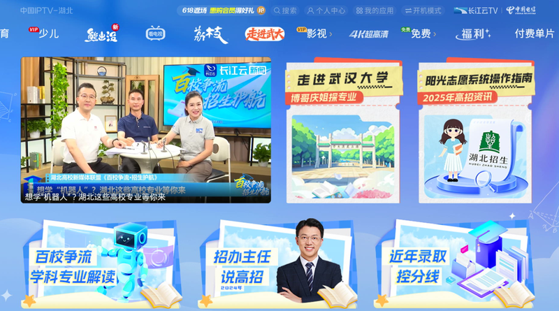 上线后,专区运营成效初步显现,日均访问量突破10万次,IPTV平台活跃度显著提升。未来,长江云TV将持续深化与高校、招办的协同联动,以技术创新驱动服务精准化、场景化,推动 “上大学”专区从阶段性高招服务枢纽向全周期教育服务平台全面演进。