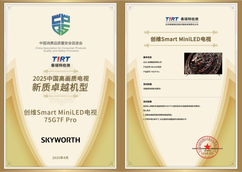 然而,创维并未止步,一个月后,全新旗舰“黑骑士”G7F Pro闪耀登场:极黑广角类纸屏Pro经权威护眼认证,Smart Mini LED背光系统以海量独立分区与先进控光技术,精准驾驭光与影的界限,暗夜如墨、亮处灼目。更通过变色龙AI画质芯片、全链路AI光晕控制、创维酷开AI超级智能体、高码率帧享影院等创新技术和资源,实现了画质、交互与内容生态的全面跃升——这是一场挑战视觉边界的沉浸式盛宴!该产品一经推出,便从众多参评产品中脱颖而出,于2025年4月荣获由中国消费品质量安全促进会颁发的“2025中国高画质电视·新质卓越机型”殊荣。