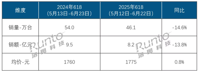 处在“史上最长”和“首个双补”下的年中大促,中国智能投影市场的表现令人意外。根据洛图科技(RUNTO)线上监测数据显示,2025年618促销期间(5月12日-6月22日),智能投影在中国传统主流电商市场的销量为46.1万台,同比下滑14.6%;销额为8.2亿元,同比下降13.8%。
