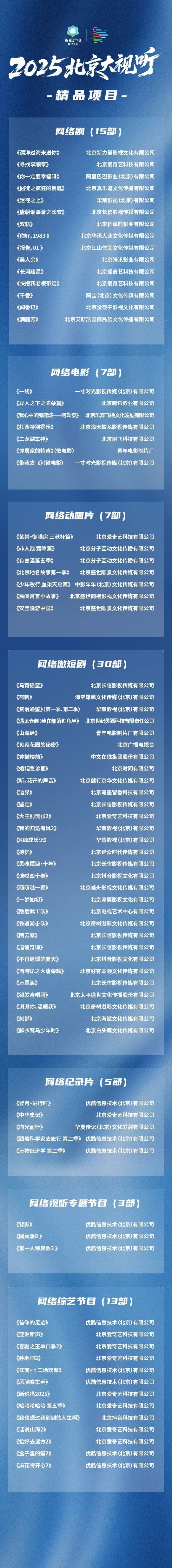 “传薪火长赓”篇章以热血叙事开掘革命历史纵深,包括《寻找李顺章》《马背摇篮》《怒刺》《信仰的足迹——北京红色记忆》等作品;“见文明长河”篇章力求讲述时代之变、中国之进,包括《资治通鉴(第一季、第二季)》《中华史记》《扎西特别得乐》等作品;“品烟火长情”篇章以平凡奋斗传递温暖治愈力量,包括《你一定要幸福呀》《萌萌哒一家》《种地吧3》等作品;“赴山水长卷”篇章以文旅融合歌颂祖国大好河山,包括《我心中的那座城——阿勒泰》《我的归途有风2》《跟着科学家去旅行 第二季》等作品;“执正义长锋”篇章以现实观照叩击时代关切命题,包括《婚姻急诊室》《边界》《听,花开的声音》等作品;“赏多元长韵”篇章则以丰富类型构筑文艺精品高峰,包括《唐朝诡事录之长安》《异人之下之陈朵篇》《灵魂摆渡·十年》等作品。