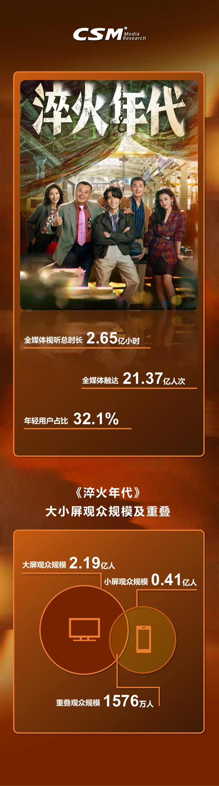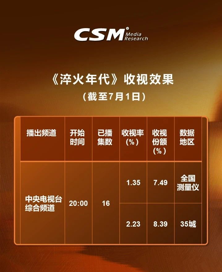首期聚焦的《藏海传》余热未散,《淬火年代》已在6月18日接棒登陆中央电视台综合频道,首集播出即拿下CSM全国网1.24%收视率、同时段第一的亮眼成绩,截至7月1日播出16集,全国网平均收视率 1.35%(平均收视份额7.49%),35中心城市平均收视率更达2.23%(收视份额8.39%)。该剧全媒体视听总时长达2.65亿小时,年轻用户占比32.1%,妥妥的 “国民剧” 热度!本期,CSM全媒“剧”焦用硬核数据剖开这部年代大剧的破圈基因!