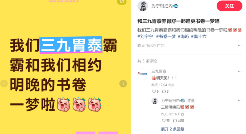 这届品牌方下场接梗的反应更是光速。三九胃泰更喜提“三舅”尊称,在开播后光速加入赞助行列,品牌官方直接在粉丝的小红书留言“明天见”,追剧姿势比粉丝还积极。