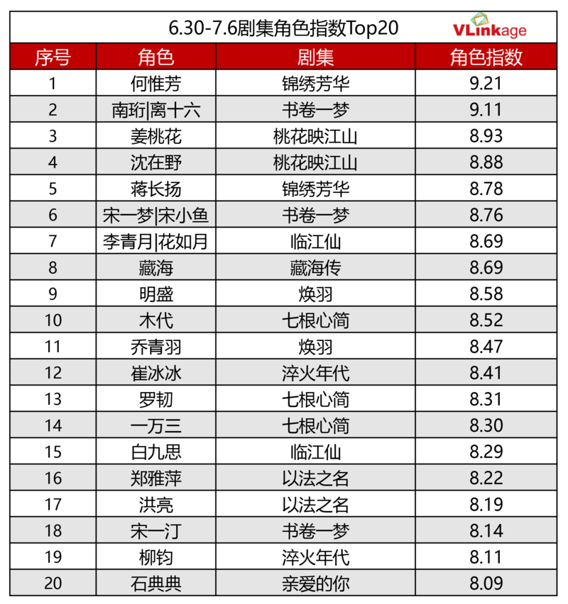 下图为上周剧集角色指数Top20,角色关注度最高的为《锦绣芳华》女主何惟芳和《书卷一梦》男主南珩。这两位来自大热古偶剧的角色,在古偶赛道有着广泛的讨论度和认知度。