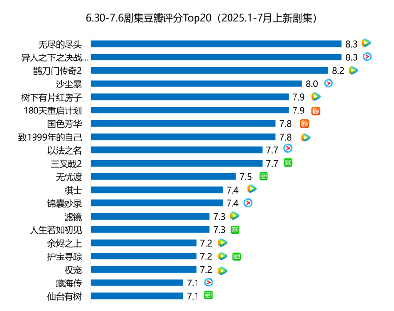 下图为上周剧集豆瓣评分Top20,《以法之名》以7.7分的口碑进入榜单,结合该剧优异的播放热度来看,这部作品极有可能成为今年暑期档综合反馈最佳的作品之一。