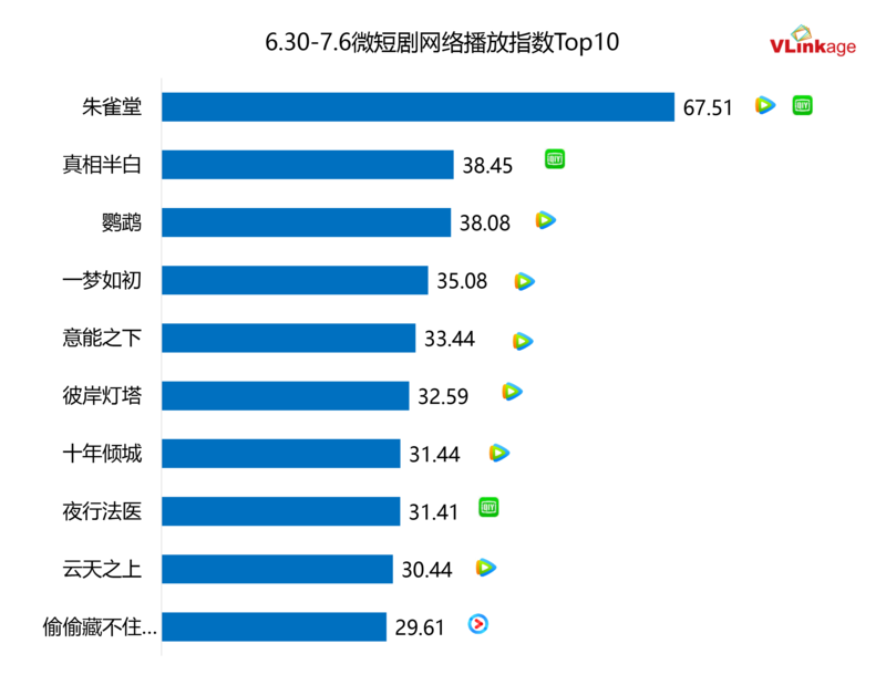 下图为上周微短剧网播指数Top10,新剧《朱雀堂》以67.51的网播指数脱颖而出,成为今年截止到上周热度最高的微短剧。