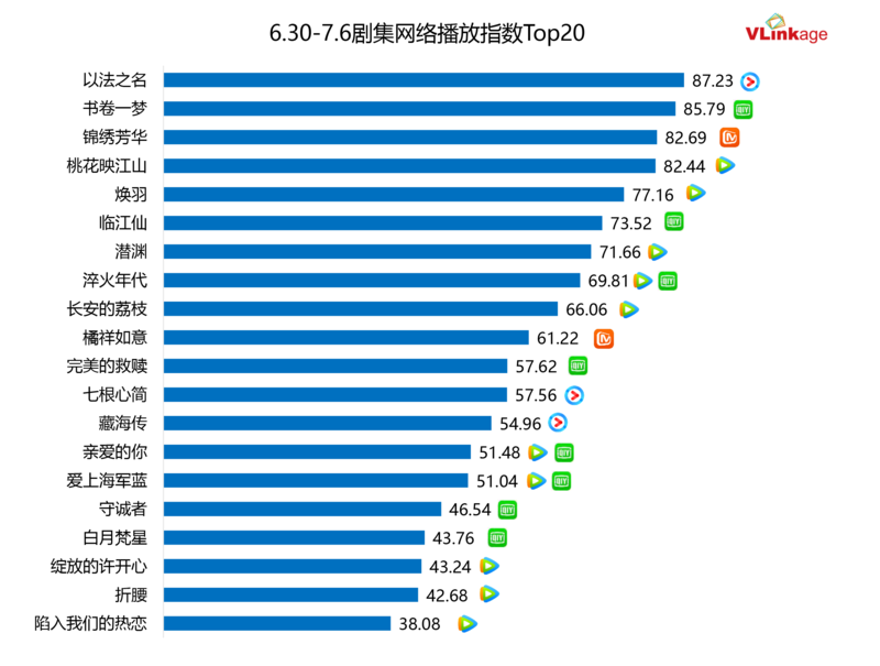 下图为上周剧集网播指数Top20,上周有4部作品热度量级在80+。其中网播指数最高的为主旋律剧《以法之名》,该剧在偶像剧扎堆的暑期档,凭借良好的观众缘出圈。