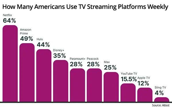 通过查看每周电视流媒体平台的使用情况,研究发现,64%的用户每周至少观看一次Netflix,高于一年前的62%。