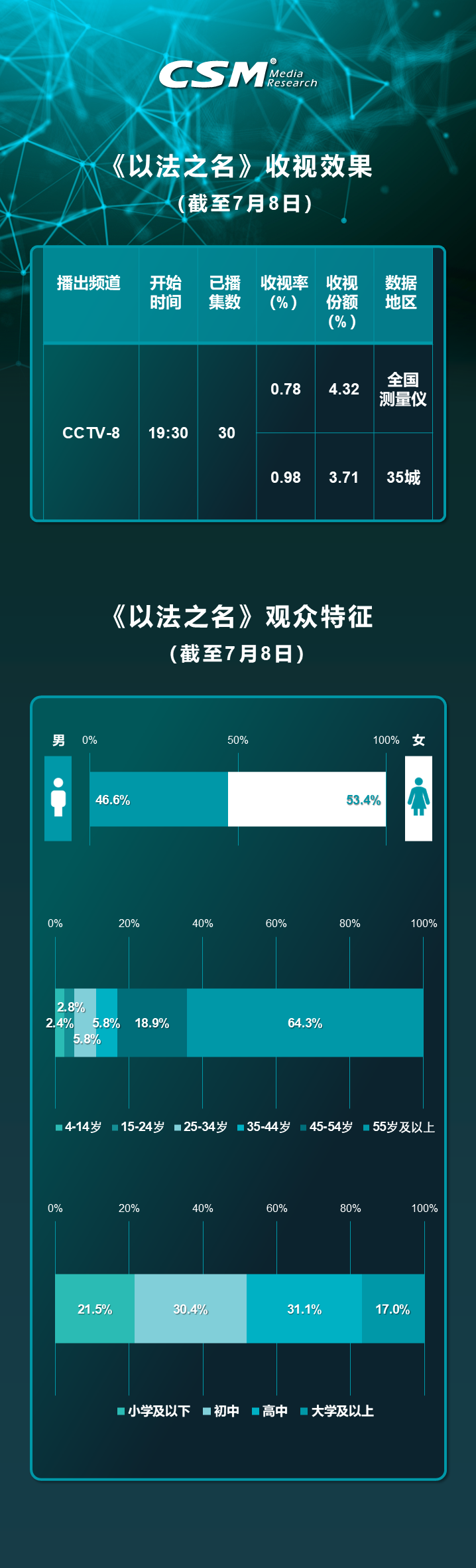 6月24日,《以法之名》登陆CCTV-8黄金档,用镜头揭开司法案件背后的真相与思考。CSM全国测量仪数据显示,截至7月8日该剧共播出30集,平均收视率稳步攀升至0.78%(平均收视份额4.32%),同时段频道排名第二,1.27亿观众通过大屏直播见证了这场“法理之战”。在35中心城市,该剧同样表现稳健,平均收视率0.98%(平均收视份额3.71%),精准触达城市观众对现实题材剧集的关注。