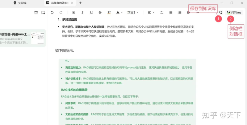 除此之外,创作界面右上角还有两个功能按钮:保存到知识库和问问ima。