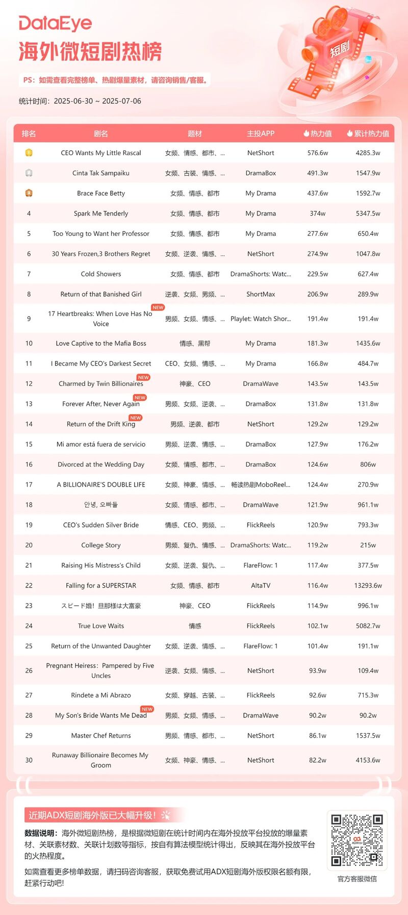 本期(6月30日-7月6日)DataEye海外微短剧热榜,《CEO Wants My Little Rascal》登顶,热值达576.6万;《Cinta Tak Sampaiku》第二,热值达491.3万;《Brace Face Betty》位列第三,热值达437.6万。