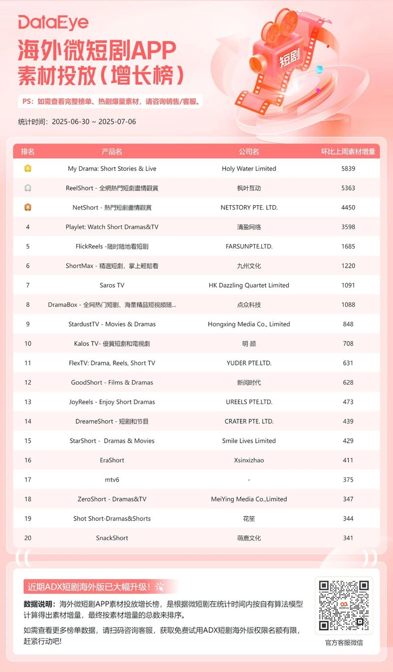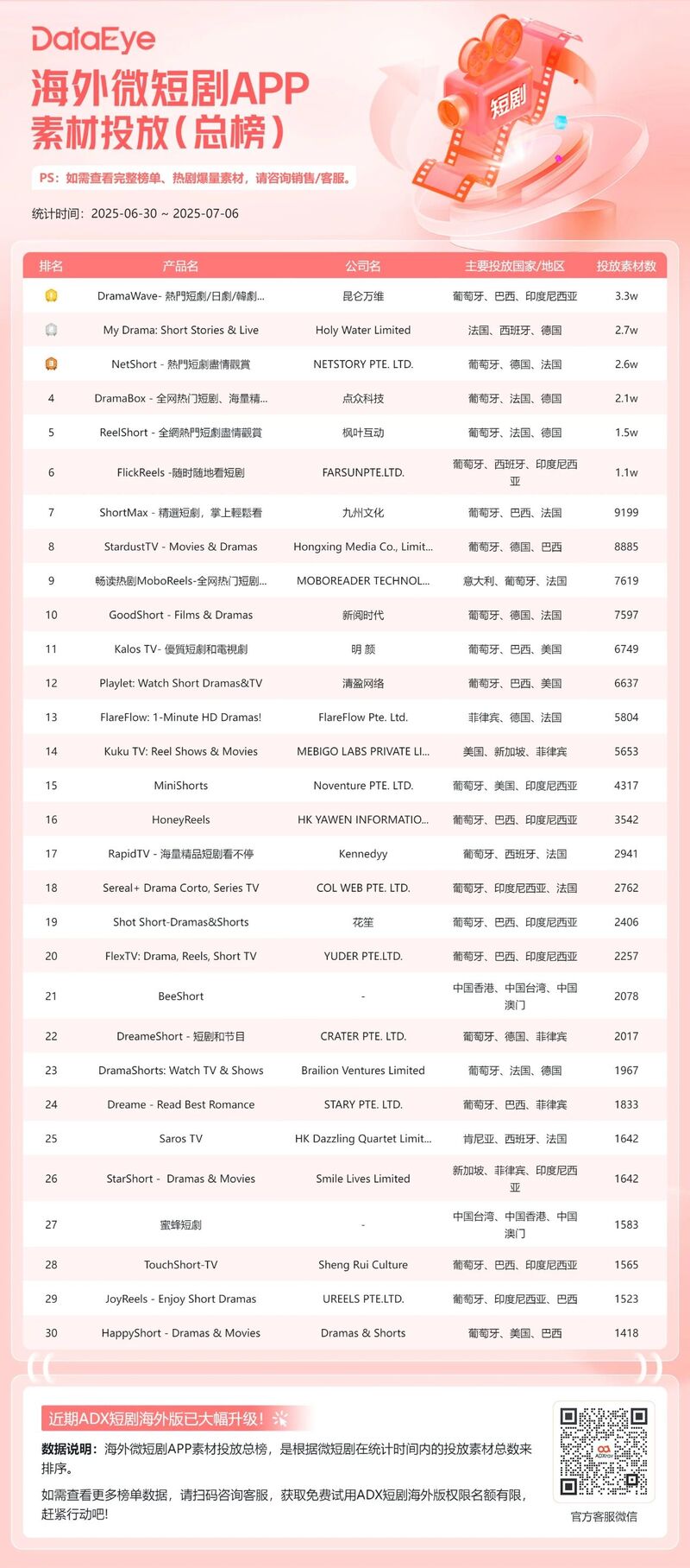 本期(6月30日-7月6日)DataEye海外微短剧APP素材投放榜,TOP3持续霸榜,DramaWave排名第一,素材投放量达3.3万组。My Drama和NetShort分别位列榜二和榜三。