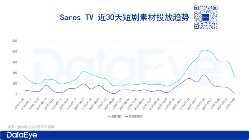 本期关注的案例是杭州溯光旗下的Saros TV。目前Saros TV已投放4245组广告素材(智能去重)。近一个月,Saros TV投放素材数有两波高峰。7月初,Saros TV投放素材数从200+组飙升至1000+组,于7月4日达到最高值1027组。