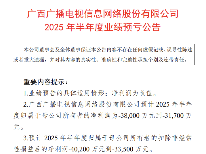 广西广电预计2025年上半年净利润亏损31,700万元至38,000万元