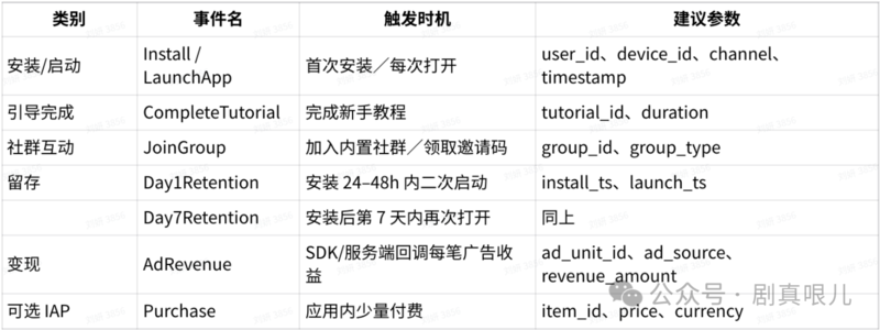 用户留存 & 互动:追踪 Install→Launch→CompleteTutorial→JoinGroup→Day1/7