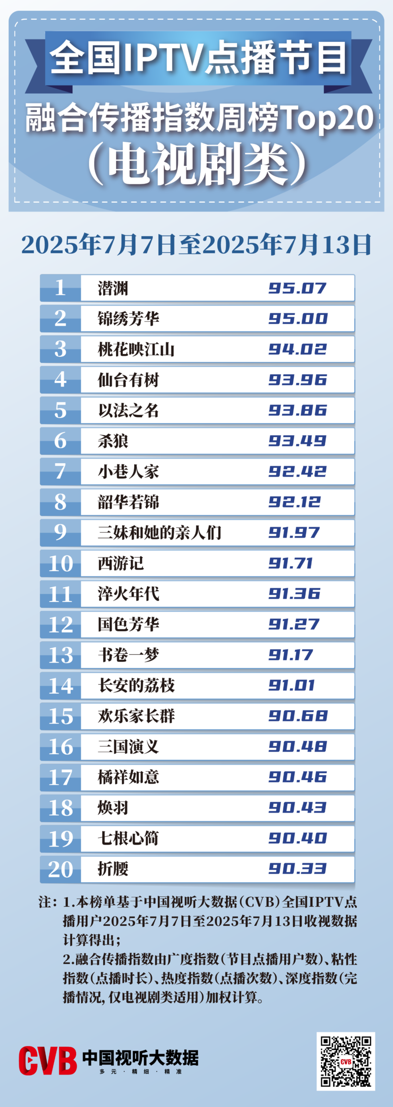全国IPTV点播节目融合传播指数周榜Top20(电视剧类)【7.7-7.13】