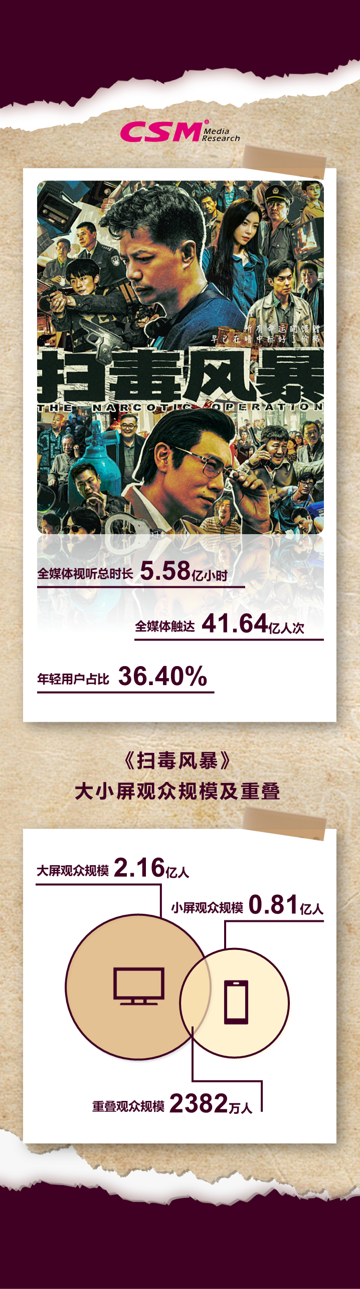 《扫毒风暴》的热度藏在每一组数据中。CSM全媒体数据(NewTAM)足以证明这部剧的“破圈力”。截至7月23日,该剧全媒体触达41.64亿人次,全媒体视听总时长5.58亿小时,年轻用户占比36.4%,印证着扫黑题材对年轻群体的强吸引力。2.16亿大屏观众守着直播追更,8100万小屏用户刷着片段讨论,其中2382万“跨屏党”占大屏观众的11.0%,他们往往在电视上看完意犹未尽,转头就用手机深挖细节。