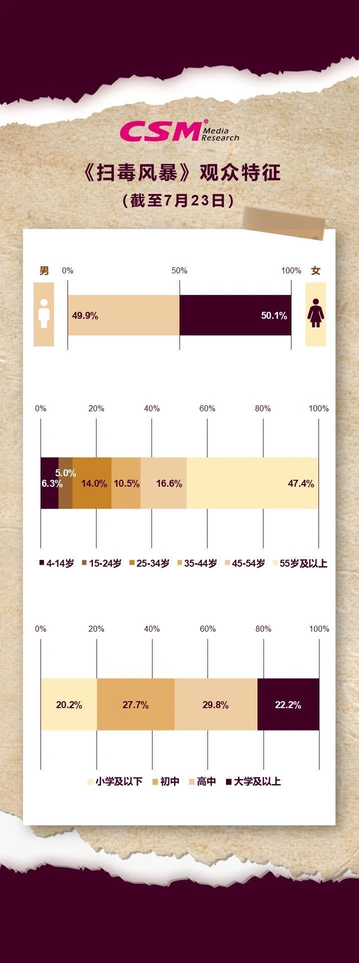 谁说扫黑剧只是“男性专属”?《扫毒风暴》的观众构成,彻底打破了这个刻板印象。CSM全国测量仪数据显示,女性观众占比50.1%,比男性观众高出0.2个百分点;年龄层更是“通杀”,25-34岁(14.0%)与35-44岁(10.5%)的中青年合计24.5%;学历覆盖同样无死角,大学及以上高学历观众占22.2%。