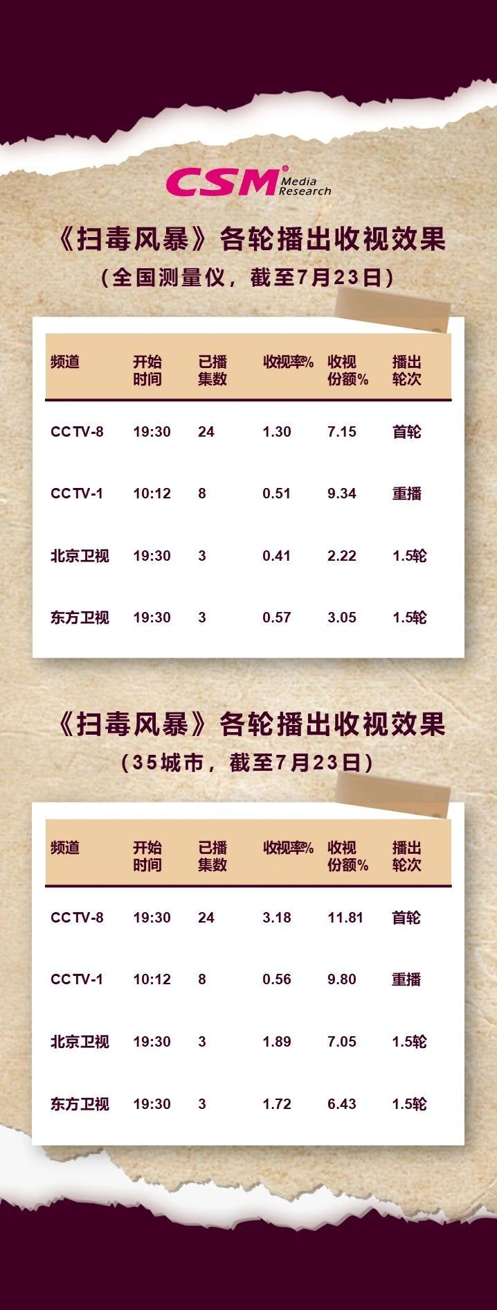 一部剧的真正热度,从来不止看首播。《扫毒风暴》的“长尾效应”同样很有看点。CSM全国测量仪数据显示,CCTV-8首播刚过半,CCTV-1就从7月21日起白天时段开始重播,已播8集,收视率0.51%(市场份额9.34%),不少观众错过直播后,专门蹲点补剧。北京卫视和上海东方卫视7月22日开始1.5轮播出,各播3集,收视率分别为0.41%、0.57%(市场份额2.22%、3.05%);在35城市,两家卫视的表现也非常亮眼,北京卫视收视率1.89%(市场份额7.05%),东方卫视收视率1.72%(市场份额6.43%)。
