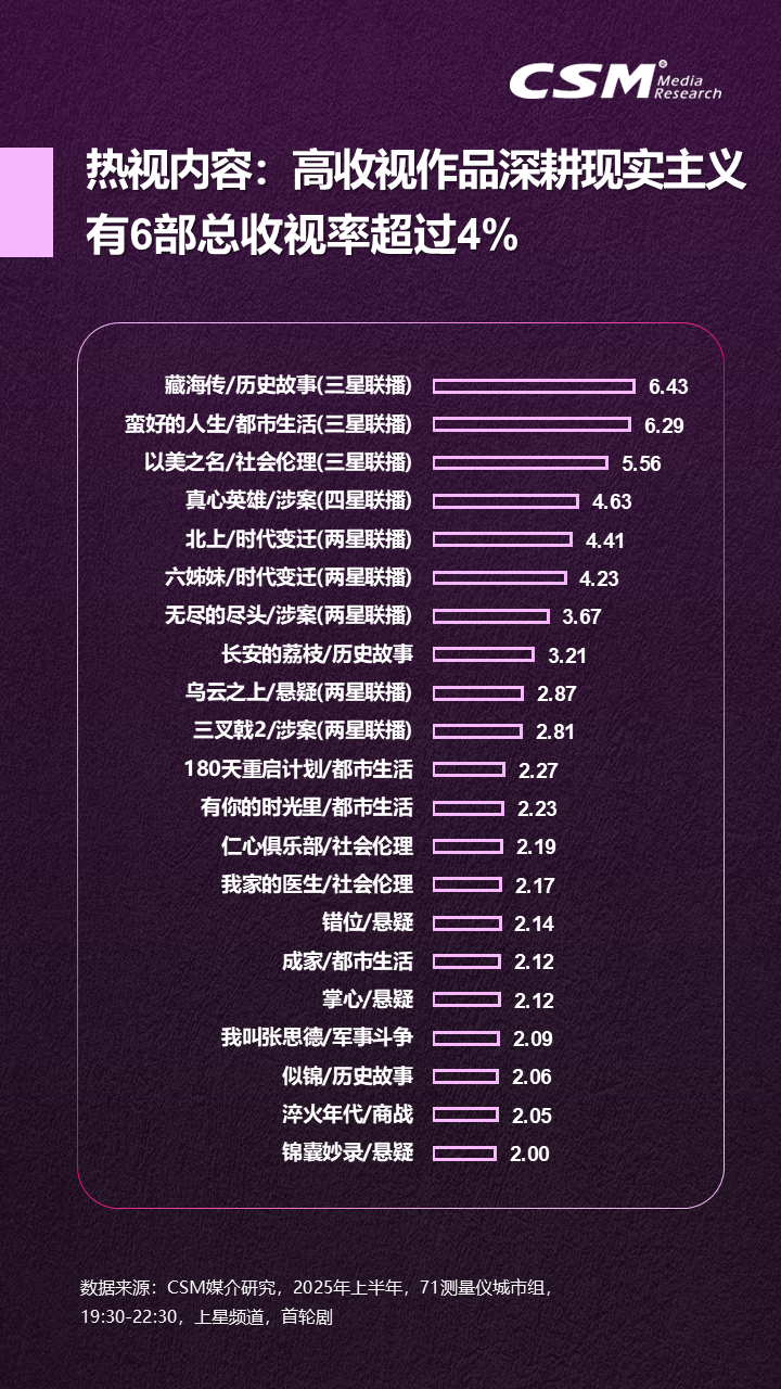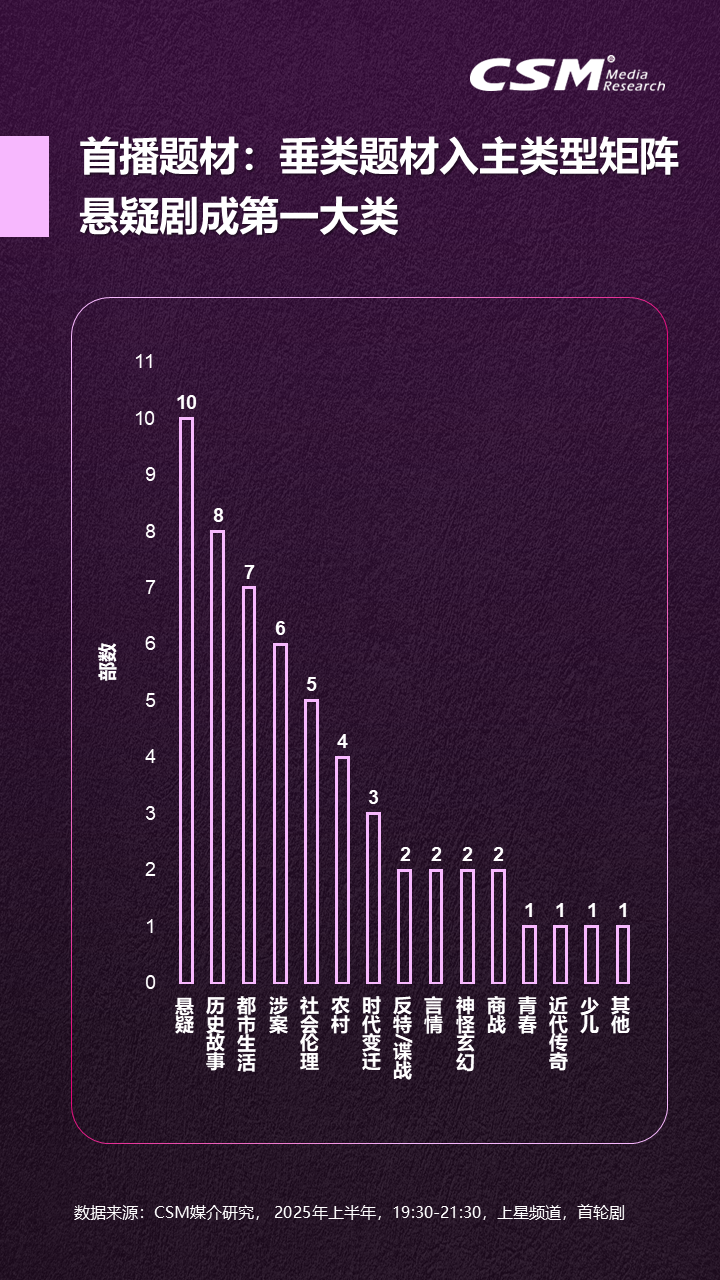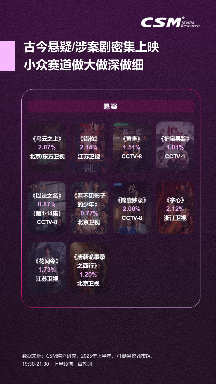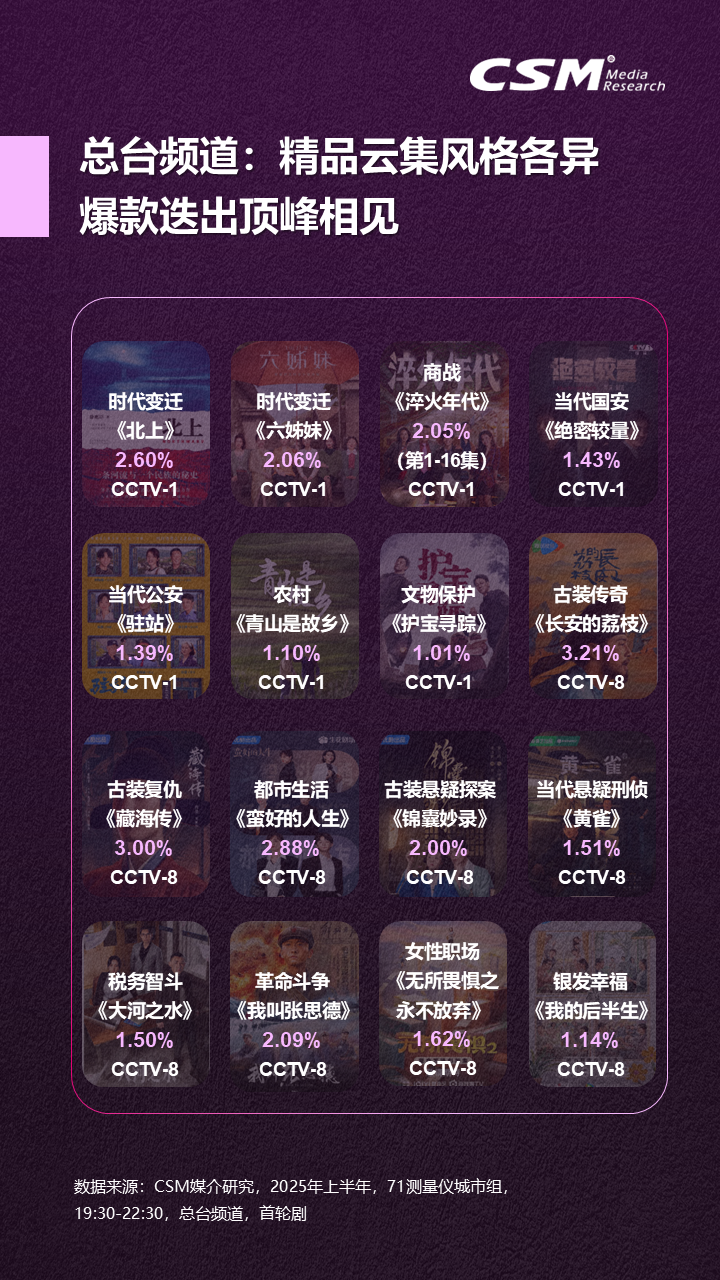 CSM媒介研究数据显示,悬疑题材以10部的数量领跑首播剧集品类,现实主义作品持续突破,6部作品总收视率超4%,成为市场刚性支柱。总台和省级上星频道各具锋芒,总台频道双雄并立,CCTV-1凭《北上》《六姊妹》等时代变迁题材领跑,CCTV-8则以《长安的荔枝》《藏海传》等历史传奇与古装IP打造收视高地;省级卫视联播剧势头强劲,《以美之名》《真心英雄》等作品因题材共鸣创下高收视。