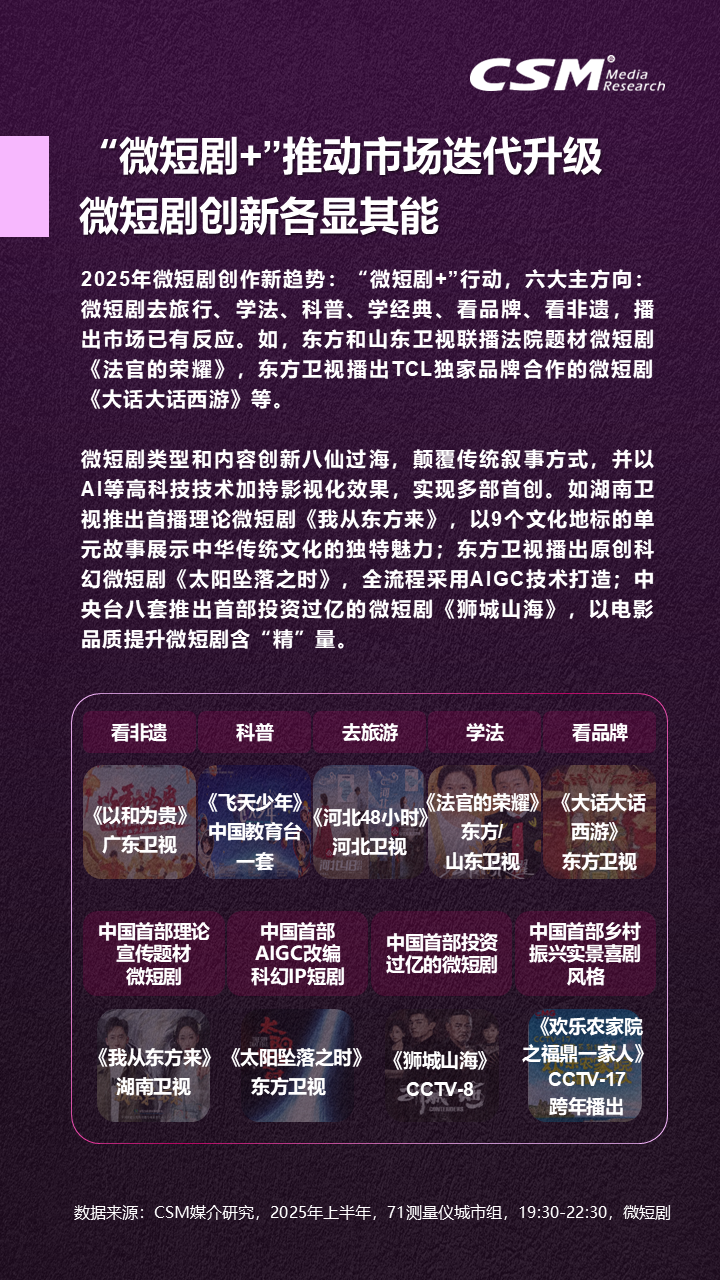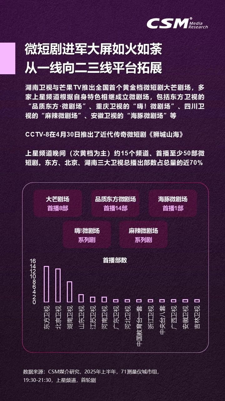 微短剧赛道加速崛起,CCTV-8推出的微短剧《狮城山海》以电影级制作拉升品质标杆;多家上星频道布局专属微剧场,东方、北京、湖南三大卫视播出量占比近七成。题材上,都市生活类占比达1/4,近17部晚间首播作品占据三分之一份额;“微短剧+”模式联动非遗、科普等领域,叠加AI技术赋能,催生《太阳坠落之时》等创新之作。