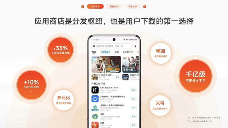 作为厂商最核心的分发枢纽,小米应用商店是用户从新机安装到日常下载的第一触点,分发量突破千亿级并持续高增;通过「搜推联动」资源部署,精准满足用户主动需求,并利用内容化专题实现价值点外显,激活潜在诉求,推动用户决策牵引与行为转化。