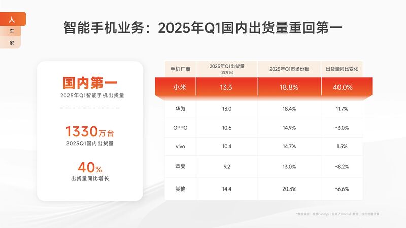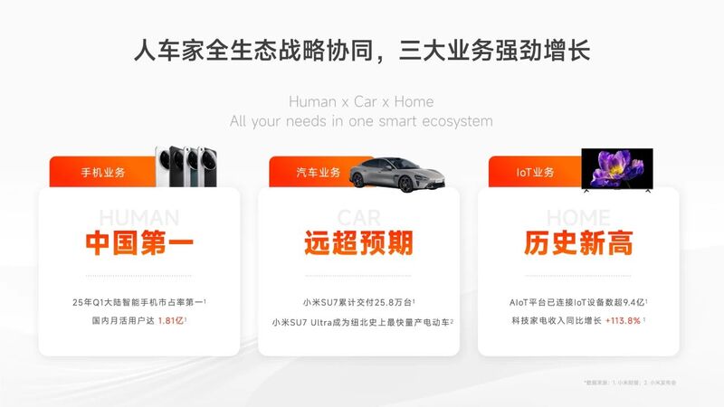 “人车家全生态”通过小米澎湃OS生态操作系统,全面打通人、车、家三大场景,实现硬件设备的无缝连接、实时协同。2025年第一季度,集团总营收再破千亿,经调利润首度超过百亿,三大核心业务——手机、汽车、IoT均实现超预期增长。战略布局迸发出强劲发展活力,为生态繁荣巩固坚实根基,也为商业营销服务赋予了扎实的底气。