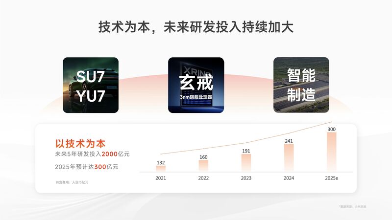 研发投入持续加码:自研芯片“玄戒O1”发布,跻身主流旗舰处理器第一梯队,未来五年将在核心技术领域继续投入 2000 亿元;