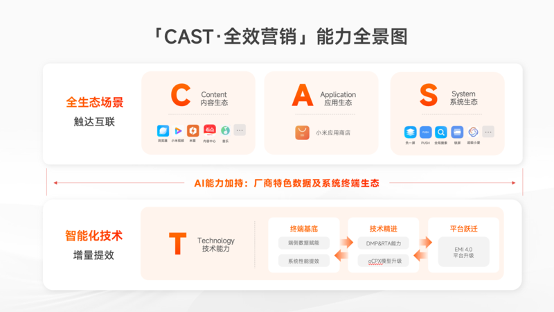 小米商业营销创新升级「CAST·全效营销」能力体系,将终端核心场景(CAS)进行整合,并以前沿AI技术(Technology)贯穿赋能,沉淀穿透终端全场景、赋能提效全周期的营销解决方案,助力广告主实现从用户洞察、触达、转化再到持续留存的全链路服务。