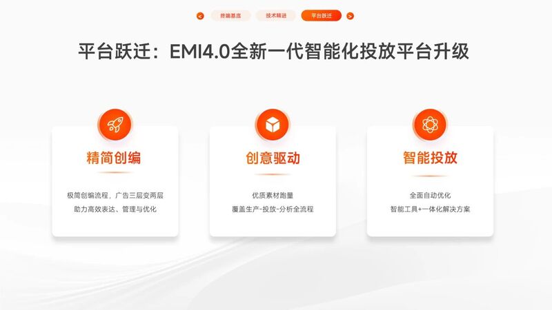 EMI4.0平台以AI技术为核心完成升级迭代,通过精简创编、创意驱动、智能投放三大创新方向,构建从计划搭建到效果优化的智能闭环,为广告主提供"提效+增量"的一站式解决方案。