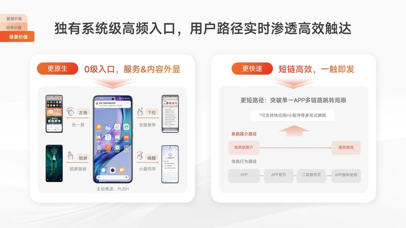 最大化利用厂商独有系统级基建优势,布局用户全生命周期下的高频使用入口,从“锁屏画报”抢占用户视觉到“小爱建议”、“负一屏”等功能多维渗透日常服务场景,再到利用“PUSH”实时推送通知,让服务更前置、更快速、更智能,为广告主打造精准曝光到长期经营的生态闭环。