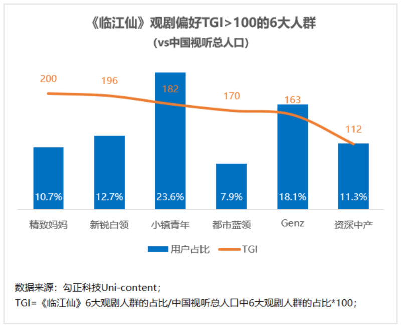 《临江仙》的热度出圈,聚合品牌声量之外,多圈层人群的广泛触达提升品牌营销效率。根据勾正Uni-content数据显示,相比同期在播的其他剧,《临江仙》触达的兴趣圈层更加广泛,精致妈妈、新锐白领、小镇青年、都市蓝领、Genz、资深中产对该剧的偏好度TGI均高于100。获得了兴趣圈层人群的注意力,即找到了品牌精准化营销的锚点。