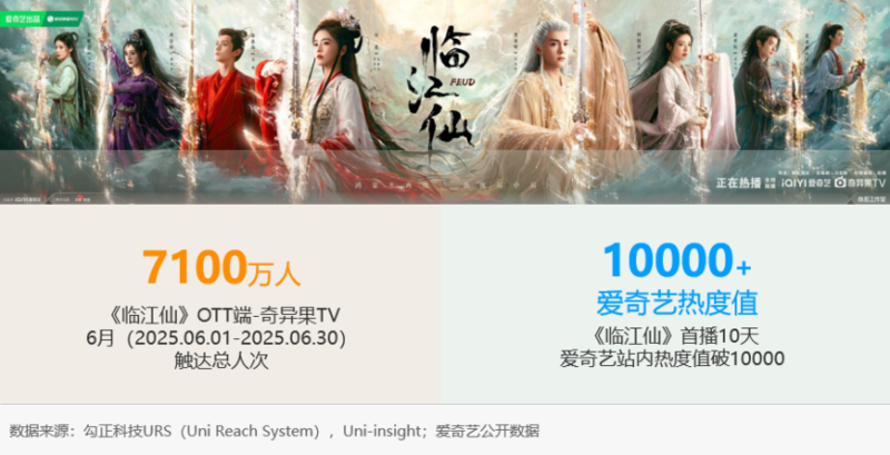 《临江仙》作为今年暑期档的唯一仙侠剧,以差异性题材优势与精妙的剧情设计,赢得暑期开门红、成为6月爆剧。根据勾正科技URS数据显示,OTT点播端,6月《临江仙》触达近7100万人次。6月15日,《临江仙》首播10天在爱奇艺站内热度值突破10000,成为当之无愧的暑期爆剧。四灵仙尊花如月和大成玄尊白九思三结三离、极限拉扯的爱情,让观众倍感“上头”,更让品牌找到超级流量入口。