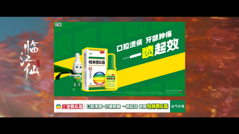 《临江仙》在斩获高流量的同时,商业价值同样亮眼。根据相关数据统计,奇异果TV《临江仙》32集全集有广,平均每集有3.4个广告,共获得可爱多、飞鹤、脉动、荣耀、好来、欧莱雅、百岁山、王小卤、OPPO、百威、未可、桂林三金等26个品牌合作,涵盖食品、美妆、3C、母婴、药品等多个行业领域。品牌们各显神通,绑定超级IP开启刷屏模式。锁定首播资源,抢占首波流量。《临江仙》未播先热,荣耀、南孚、脉动、外星人、天猫、桂林三金等品牌前瞻锁定首播资源。以桂林西瓜霜为例,在《临江仙》正片第5分钟以鸣谢贴的方式出现,并在片尾处邀请大家“仙气共享”,回味“上头”剧情的同时,不忘提醒观众“口腔溃疡、牙龈肿痛,一喷起效、快喷桂林西瓜霜”,刻画品牌记忆点。