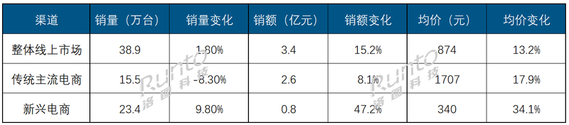 两类渠道的市场规模走势、价格结构和产品分布相差极大。根据洛图科技(RUNTO)线上数据显示,传统主流电商的销量占到了整体线上市场的约40%,为15.5万台,同比下降8.3%;而新兴电商的销量占到了约60%,为23.4万台,同比增长9.8%。