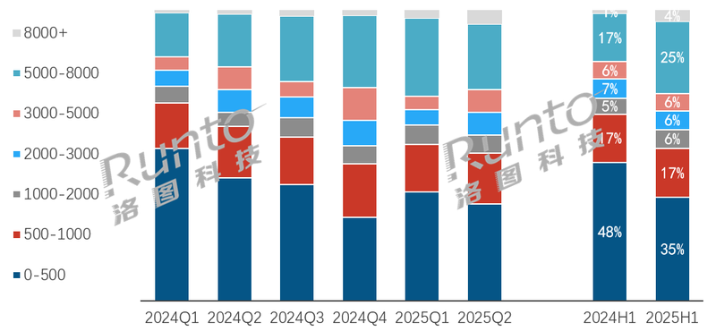 二、价格分布:500元以下低端市场份额下滑;5000元以上高端份额增长显著