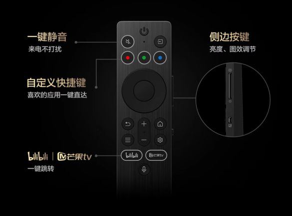 而在TCL的一些电视产品上,不仅有支持用户自定义的快捷键,还有bilibili、芒果TV的定制按键。